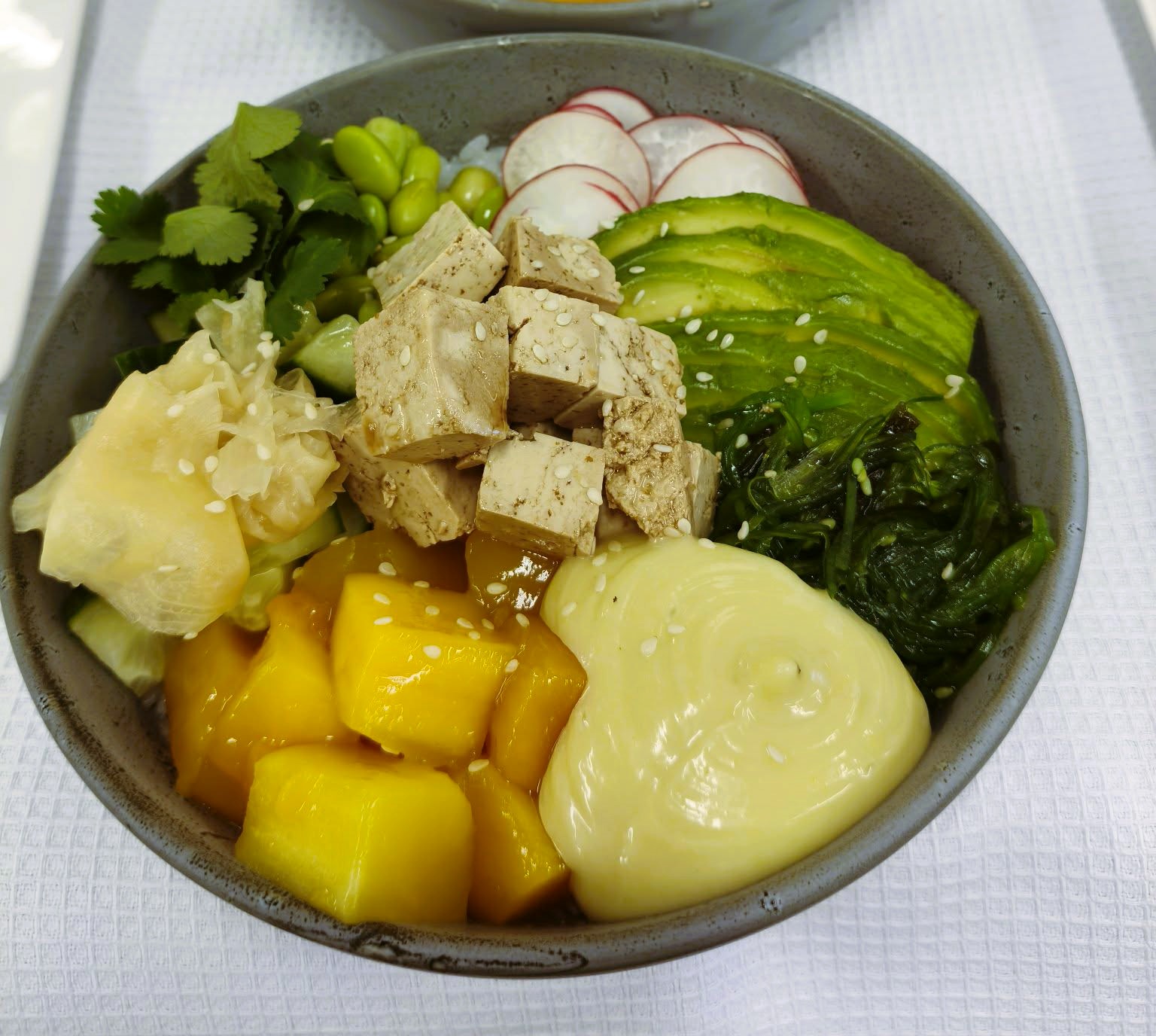 Serveras med ris, bönor, mango, avokado, gurka, majonnäs, tofu samt soja